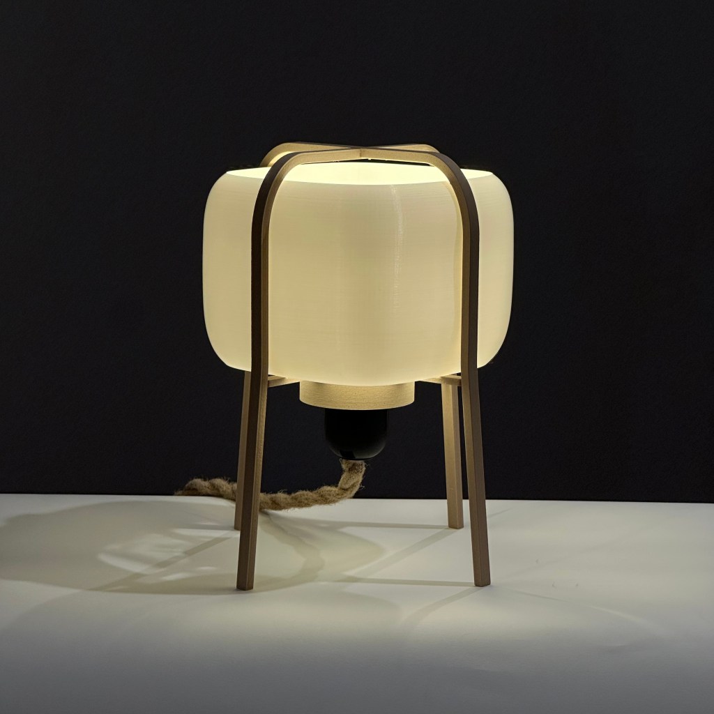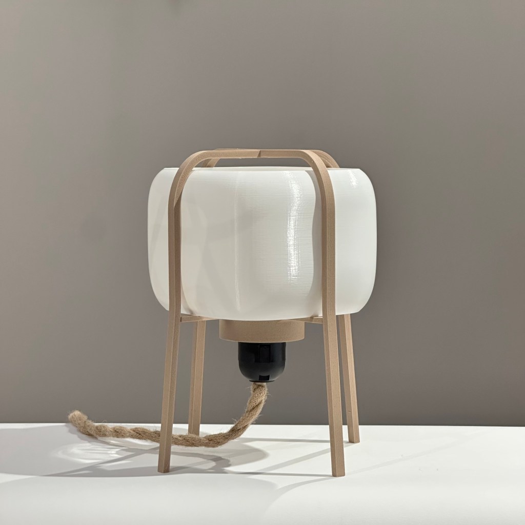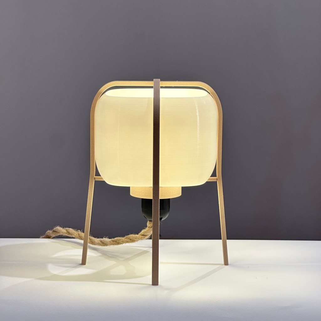Fabricada con impresión 3D a partir de materiales biocompostables —derivados del maíz y la caña de azúcar— y una estructura de madera natural, que aporta calidez, estabilidad y carácter, sin perder la ligereza visual.