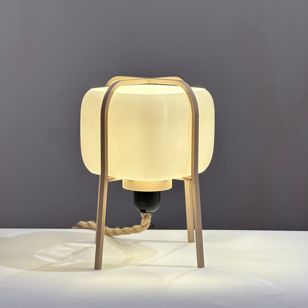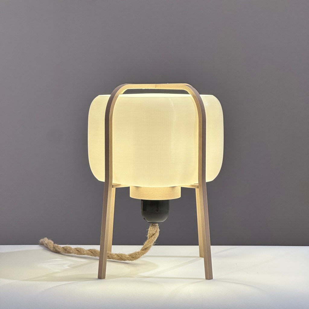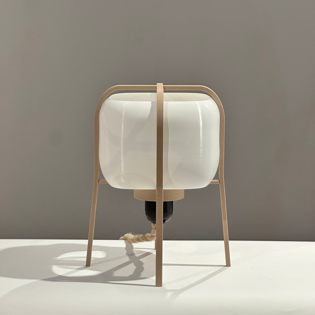 Fabricada con impresión 3D a partir de materiales biocompostables —derivados del maíz y la caña de azúcar— y una estructura de madera natural, que aporta calidez, estabilidad y carácter, sin perder la ligereza visual.